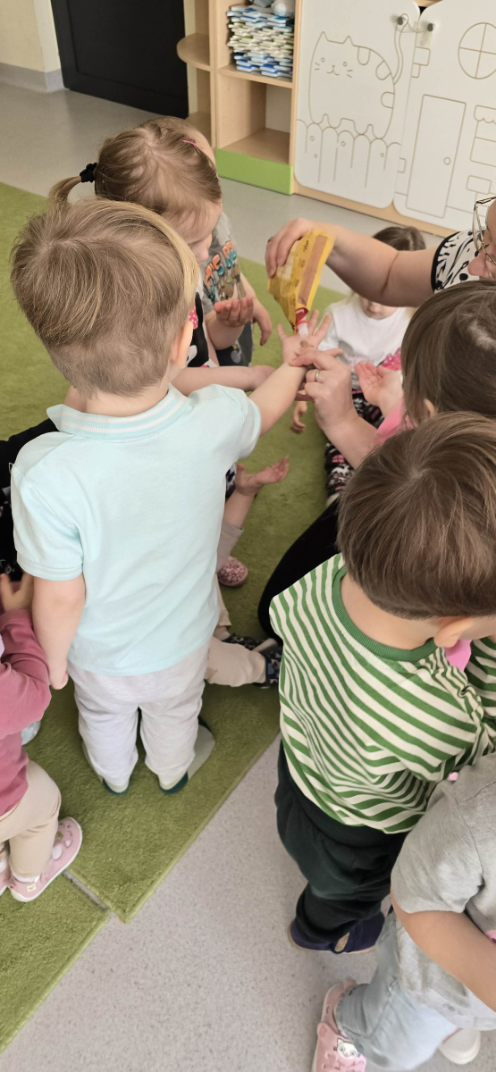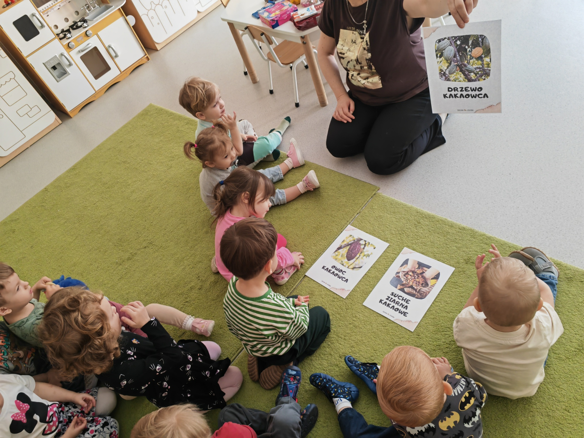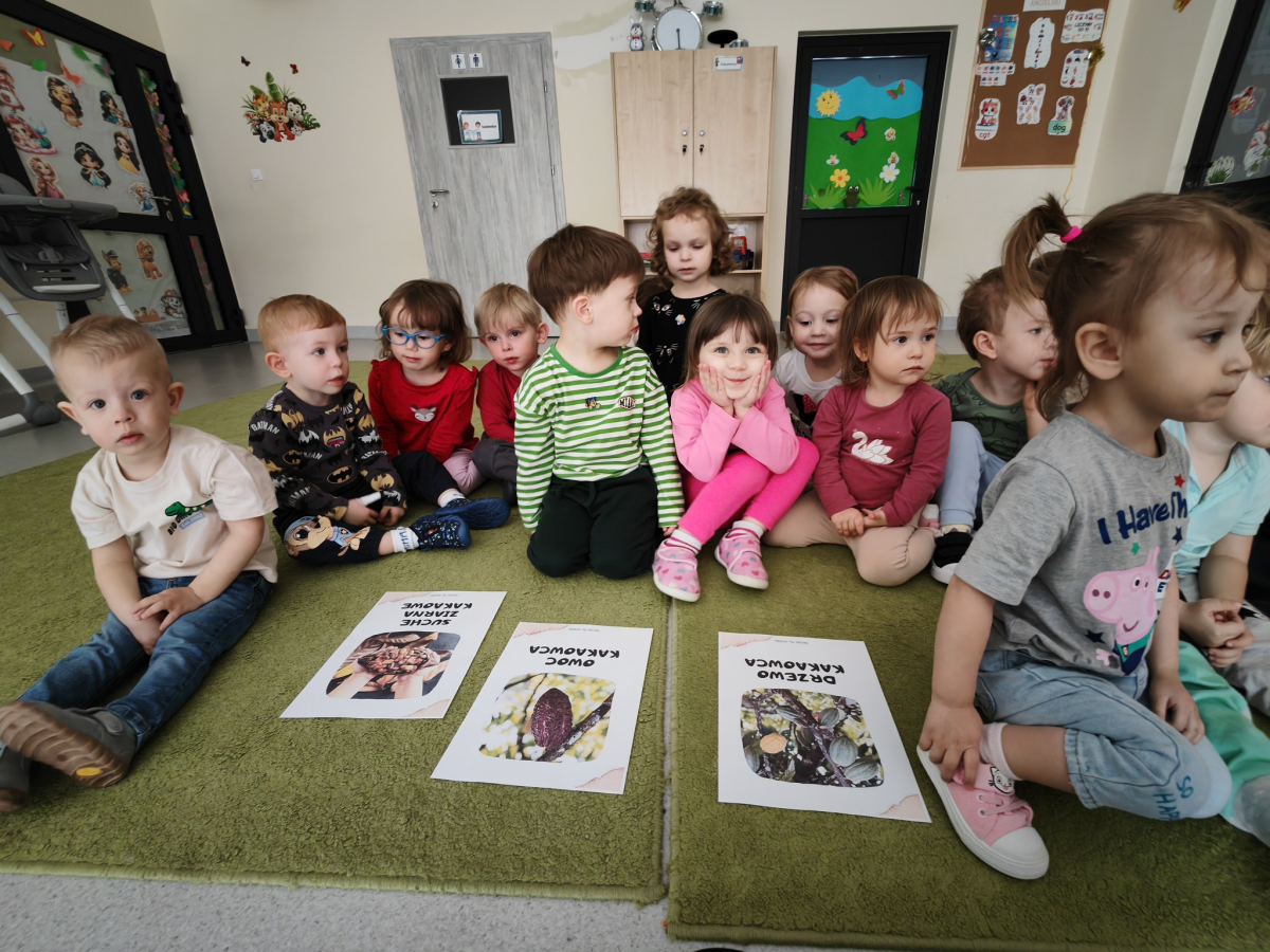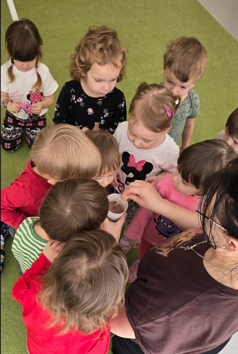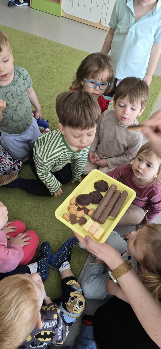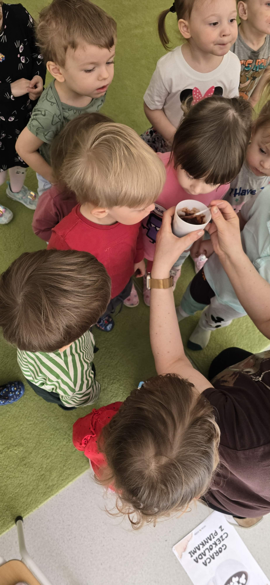W Żłobku świętowaliśmy Dzień Czekolady. Podczas zajęć dzieci dowiedziały się, skąd bierze się kakao i jak powstaje czekolada – od ziaren kakaowca aż po gotową tabliczkę. Poznały również różne rodzaje czekolady: mleczną, gorzką i białą, a także produkty czekoladowe, które dobrze znają na co dzień. Najwięcej radości sprawiły zabawy sensoryczne – dzieci mogły dotykać, wąchać i poznawać różne „czekoladowe” konsystencje. Było dużo śmiechu, ciekawości i słodkich wrażeń! To był dzień pełen nowych doświadczeń i pysznych odkryć.