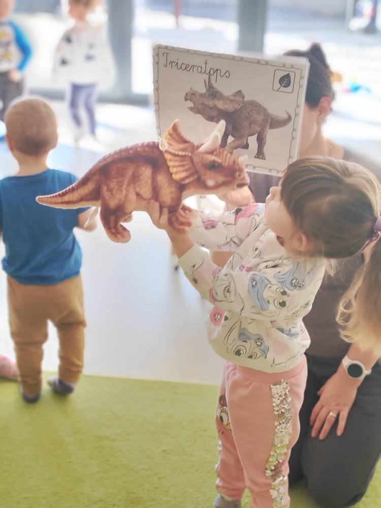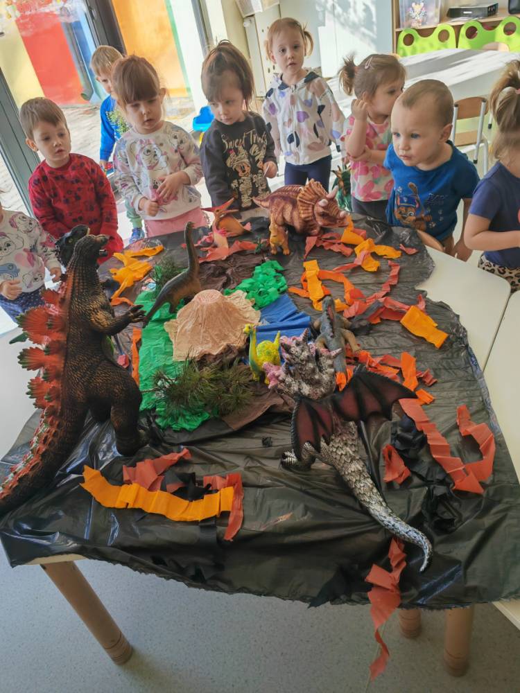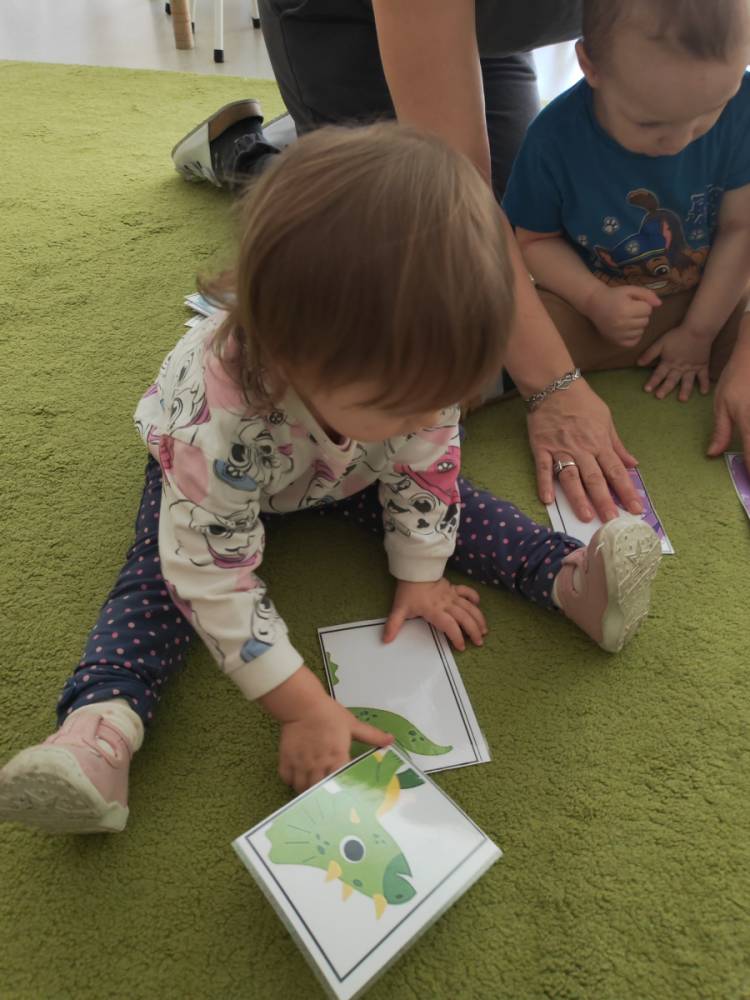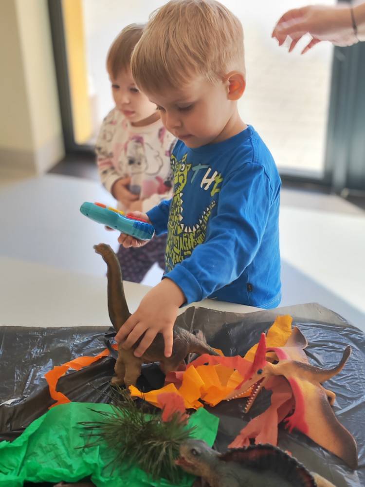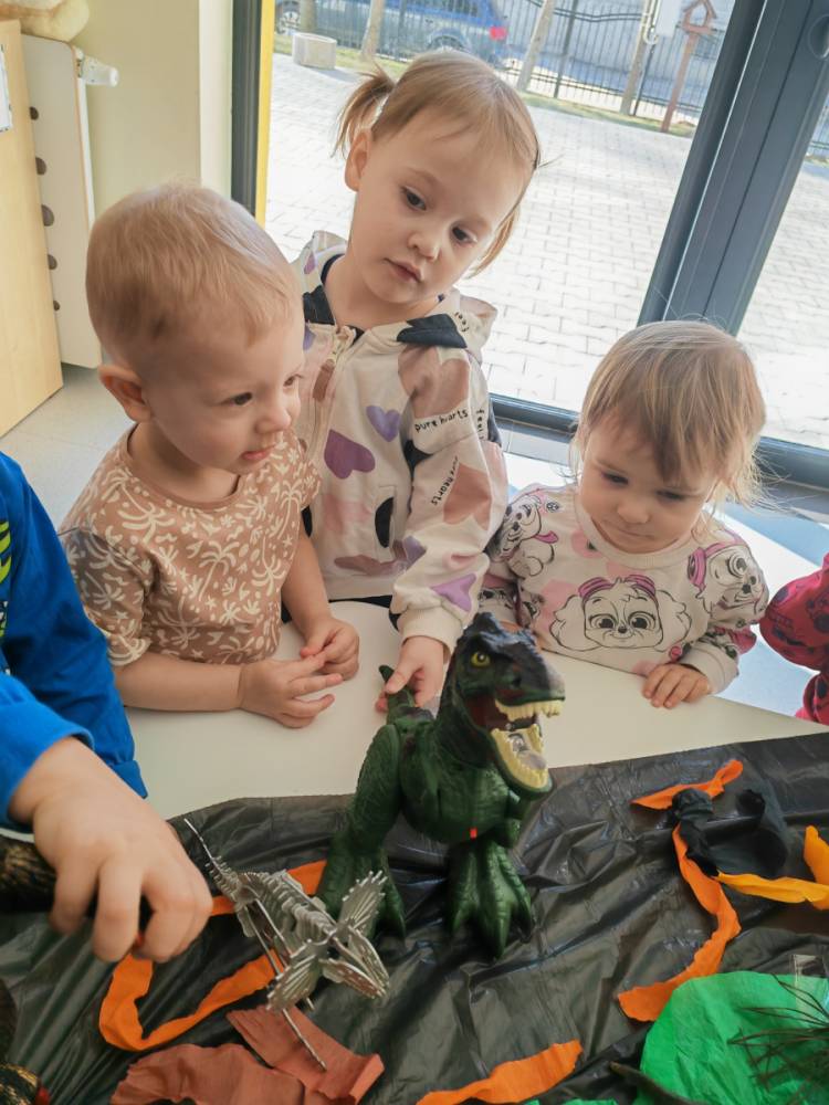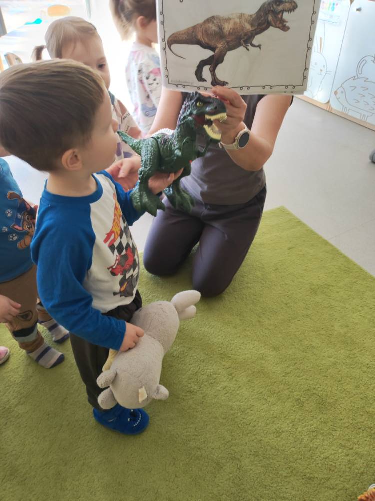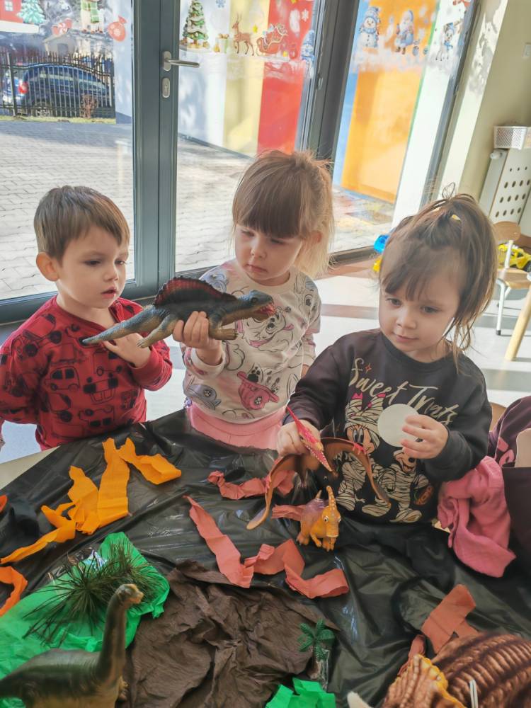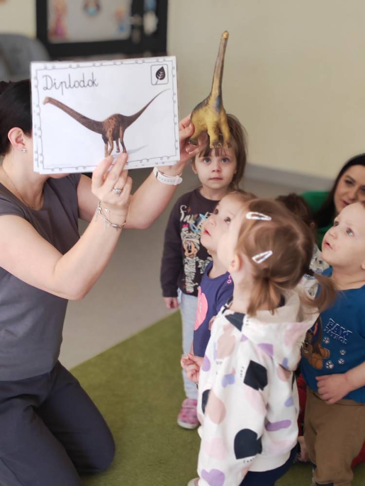 Przenieśliśmy się do prehistorycznej krainy, gdzie poznawaliśmy różne gatunki dinozaurów i wspólnie szukaliśmy podobnych „okazów” wśród naszych dinozaurów z sali. Dzieci z ogromnym zaangażowaniem porównywały kolory, wielkości i kształty, rozwijając przy tym spostrzegawczość i słownictwo.