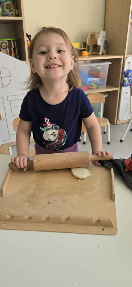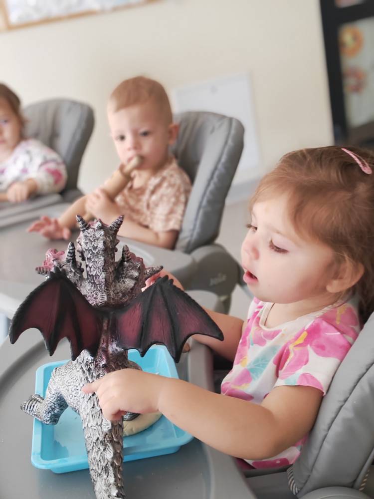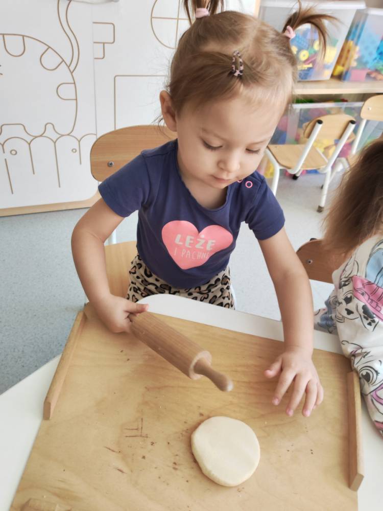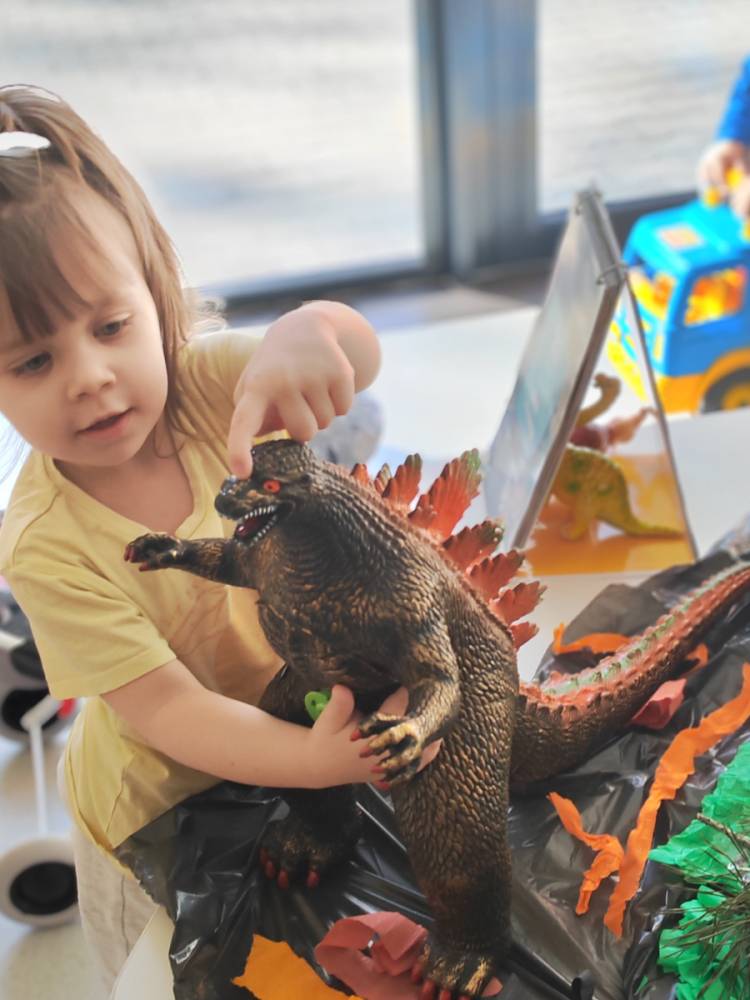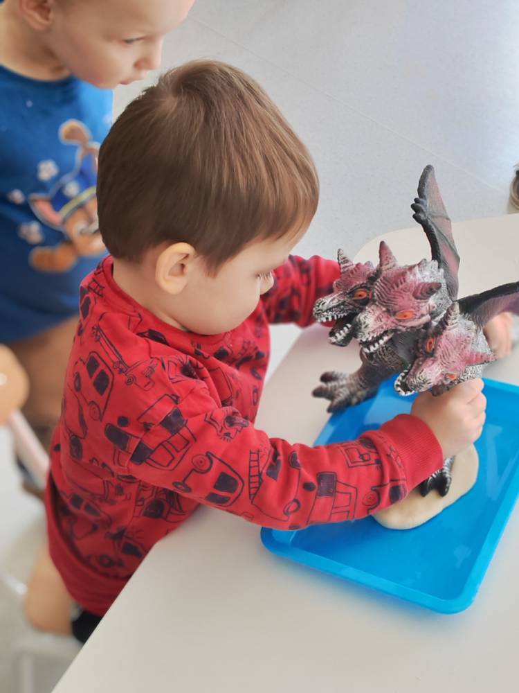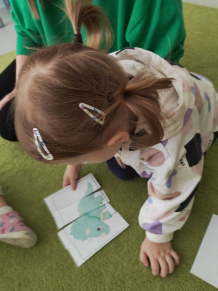 Nie zabrakło także układania puzzli z dinozaurami, które ćwiczyły koncentrację i koordynację wzrokowo–ruchową. Nasze dzielne Krasnale wcieliły się również w małych paleontologów i odbijały stopę dinozaura w masie solnej – powstały wyjątkowe, prehistoryczne pamiątki!