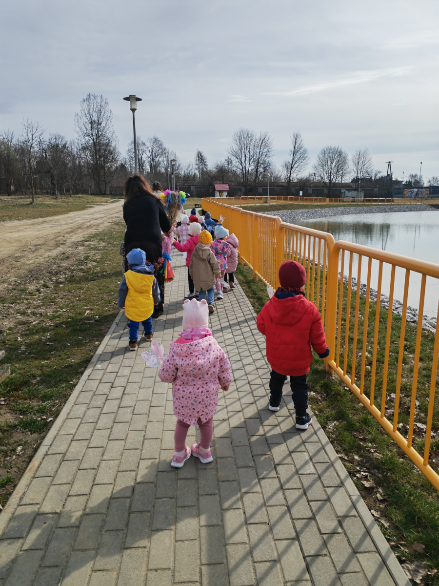 Przygotowania do powitania wiosny rozpoczęliśmy już kilka dni wcześniej. Dzieci z dużym zaangażowaniem tworzyły Marzannę – maluszki odklejały i przyklejały kolorowe elementy, wybierały ozdoby i wspólnie nadawały jej wyjątkowy, wiosenny wygląd. Była to nie tylko świetna zabawa, ale także okazja do rozwijania sprawności rączek i wspólnego działania. W piątek 20 marca wyruszyliśmy na radosny wiosenny pochód. Dzieci z ciekawością obserwowały otoczenie i szukały pierwszych oznak wiosny – pojawiających się kwiatów, zielonej trawy czy śpiewających ptaków Podczas spaceru nie brakowało uśmiechów, rozmów i dziecięcej radości. Każde, nawet najmniejsze odkrycie wywoływało ogromne emocje i zachwyt. o był piękny, pełen wrażeń dzień, który na długo zostanie w naszej pamięci