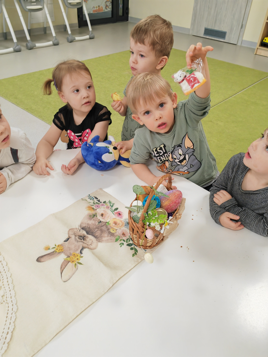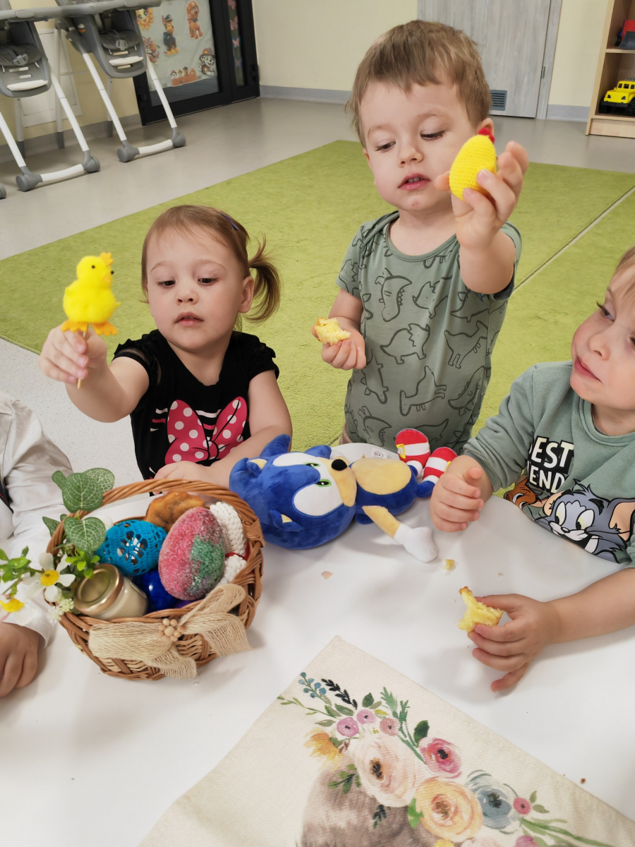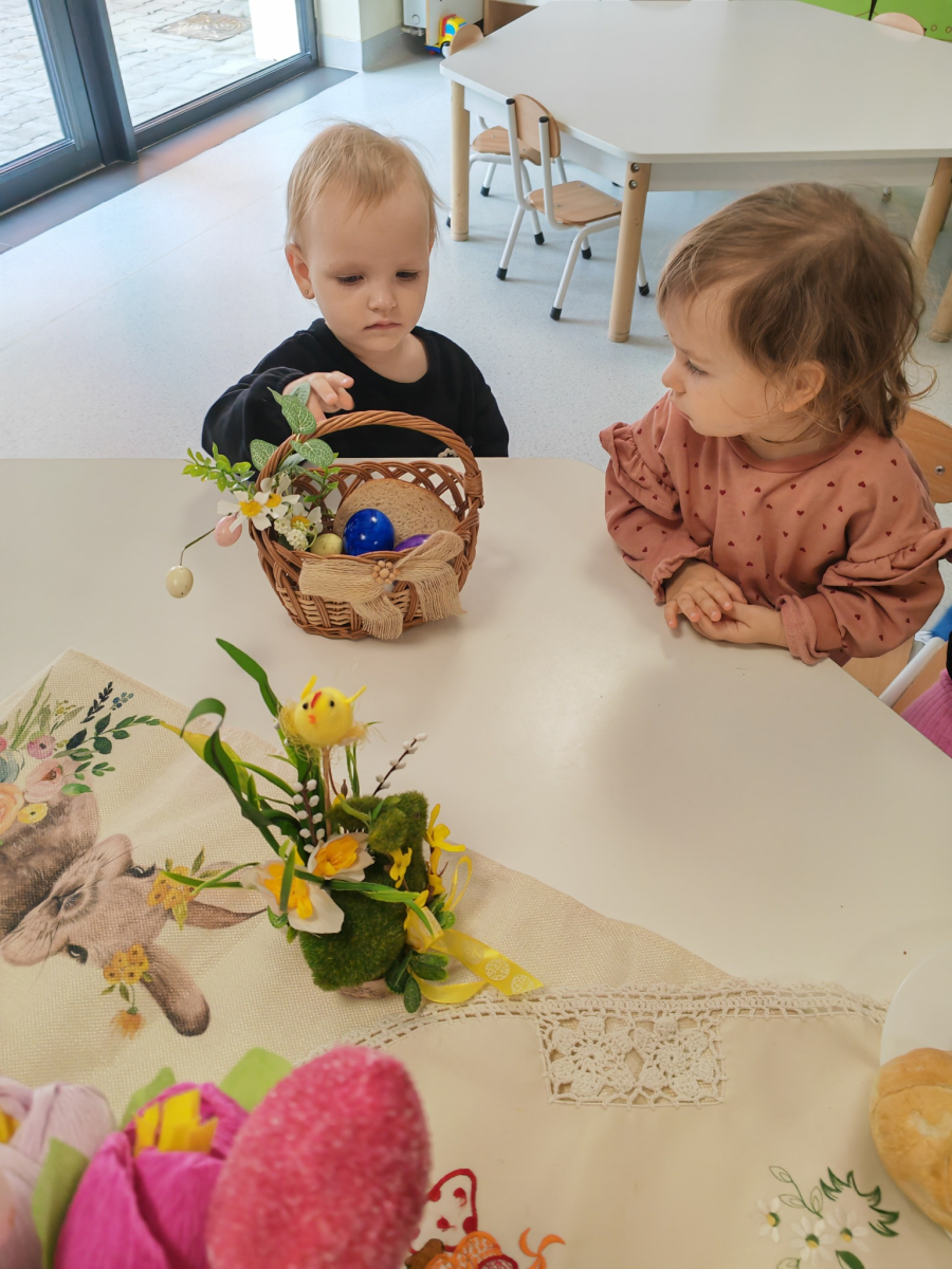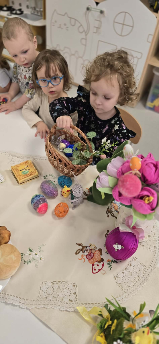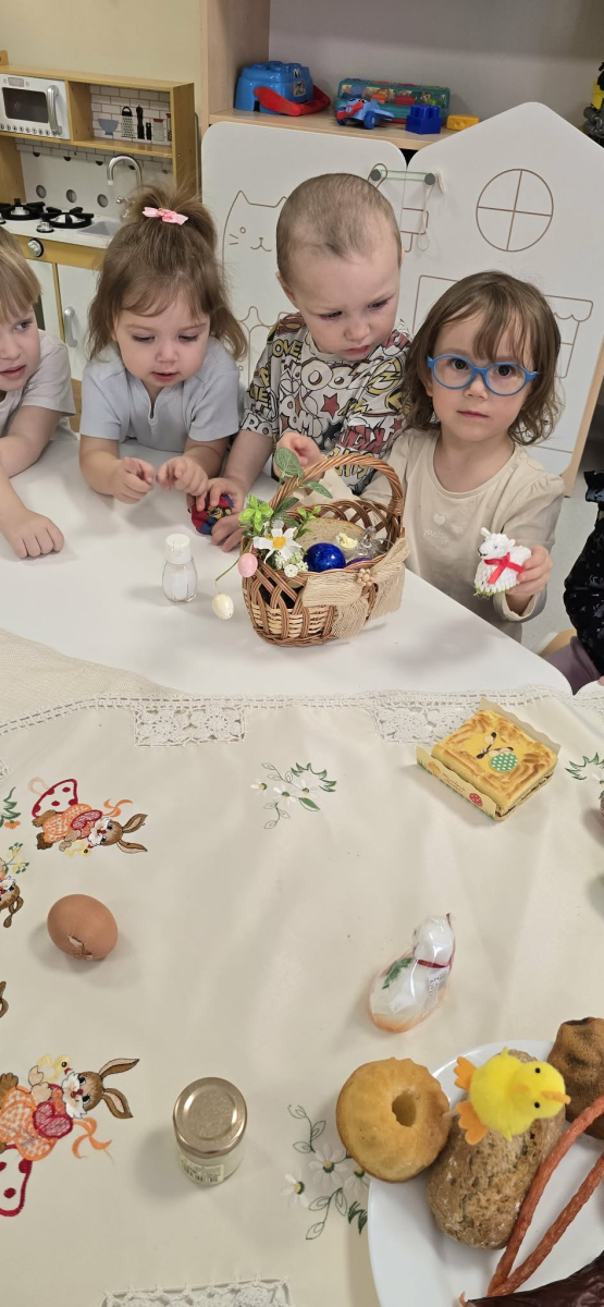 W naszym Żłobku święta Wielkanocy stały się okazją do poznawania tradycji w sposób praktyczny i radosny. Maluszki z ogromnym zainteresowaniem oglądały wielkanocny koszyczek oraz produkty, które się w nim znajdują. Każdy element koszyczka – jajeczka, chlebek, sól, wędlinę, chrzan oraz baranka – został dokładnie pokazany, a dzieci dowiedziały się, że każdy z nich ma swoje symboliczne znaczenie w tradycji wielkanocnej. Zajęcia miały charakter sensoryczny – dzieci mogły dotykać, wąchać i oglądać wszystkie produkty, co rozwijało ich zmysły i wspomagało poznawanie nowych słów. Maluszki z entuzjazmem uczestniczyły w rozmowach na temat znaczenia poszczególnych przedmiotów, zadawały pytania i dzieliły się swoimi spostrzeżeniami. Atmosfera zajęć była pełna radości i ciepła, a wspólne odkrywanie tradycji wprowadziło dzieci w prawdziwie świąteczny nastrój. Warsztaty pozwoliły nie tylko poznać zwyczaje wielkanocne, ale także rozwijały ciekawość świata, kreatywność i umiejętność współpracy w grupie. Dzięki takim spotkaniom maluchy uczą się, że tradycje można poznawać nie tylko słowami, ale także poprzez zabawę i doświadczenie.