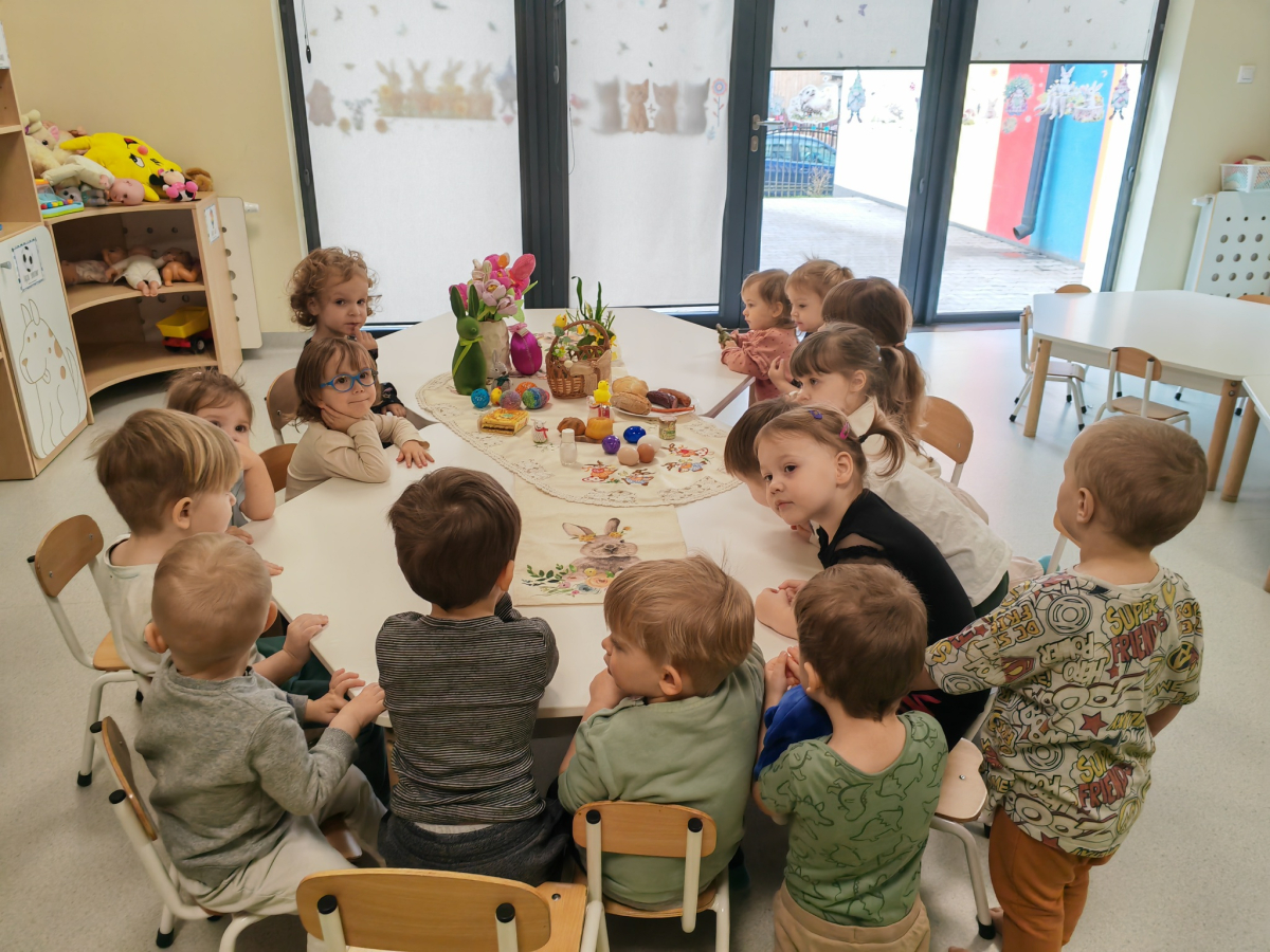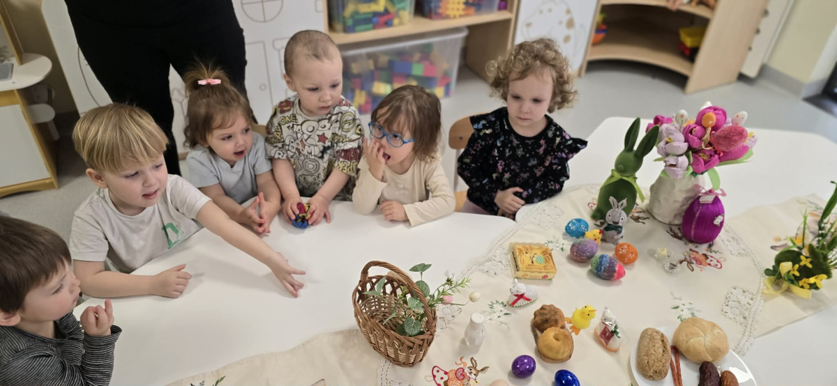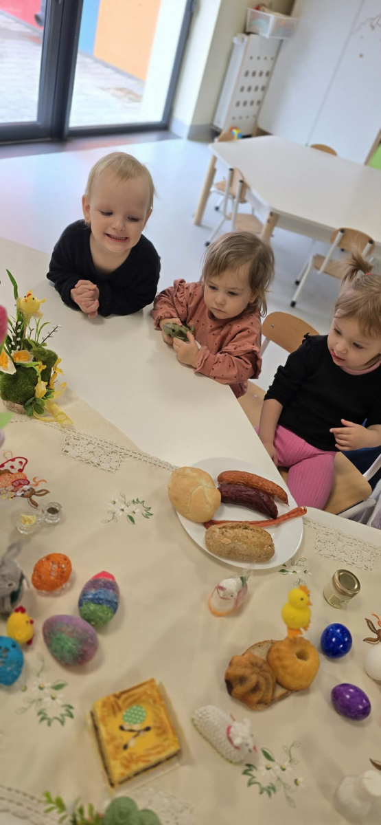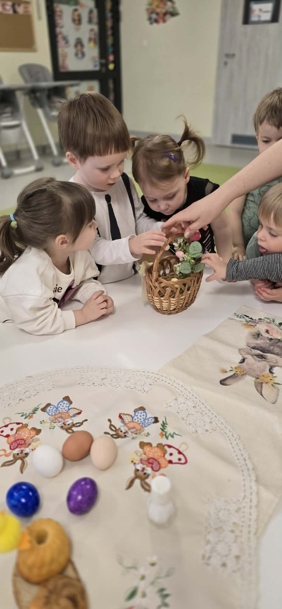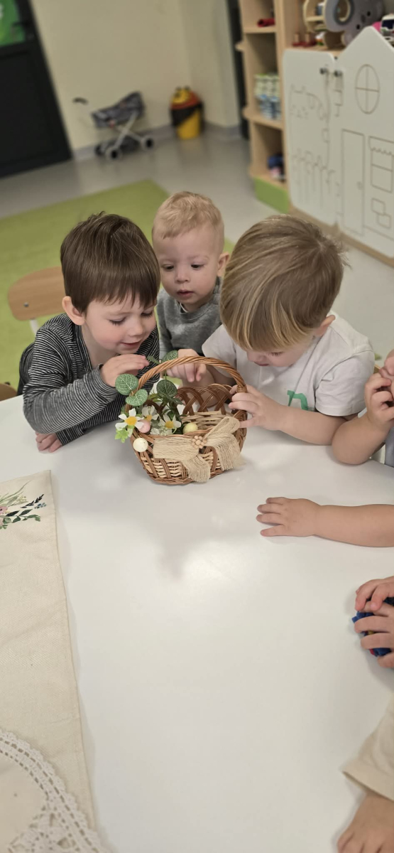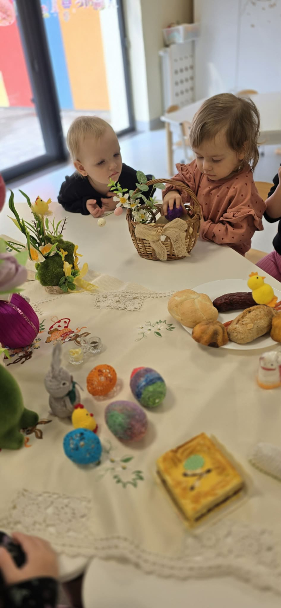 W naszym Żłobku święta Wielkanocy stały się okazją do poznawania tradycji w sposób praktyczny i radosny. Maluszki z ogromnym zainteresowaniem oglądały wielkanocny koszyczek oraz produkty, które się w nim znajdują. Każdy element koszyczka – jajeczka, chlebek, sól, wędlinę, chrzan oraz baranka – został dokładnie pokazany, a dzieci dowiedziały się, że każdy z nich ma swoje symboliczne znaczenie w tradycji wielkanocnej. Zajęcia miały charakter sensoryczny – dzieci mogły dotykać, wąchać i oglądać wszystkie produkty, co rozwijało ich zmysły i wspomagało poznawanie nowych słów. Maluszki z entuzjazmem uczestniczyły w rozmowach na temat znaczenia poszczególnych przedmiotów, zadawały pytania i dzieliły się swoimi spostrzeżeniami. Atmosfera zajęć była pełna radości i ciepła, a wspólne odkrywanie tradycji wprowadziło dzieci w prawdziwie świąteczny nastrój. Warsztaty pozwoliły nie tylko poznać zwyczaje wielkanocne, ale także rozwijały ciekawość świata, kreatywność i umiejętność współpracy w grupie. Dzięki takim spotkaniom maluchy uczą się, że tradycje można poznawać nie tylko słowami, ale także poprzez zabawę i doświadczenie.