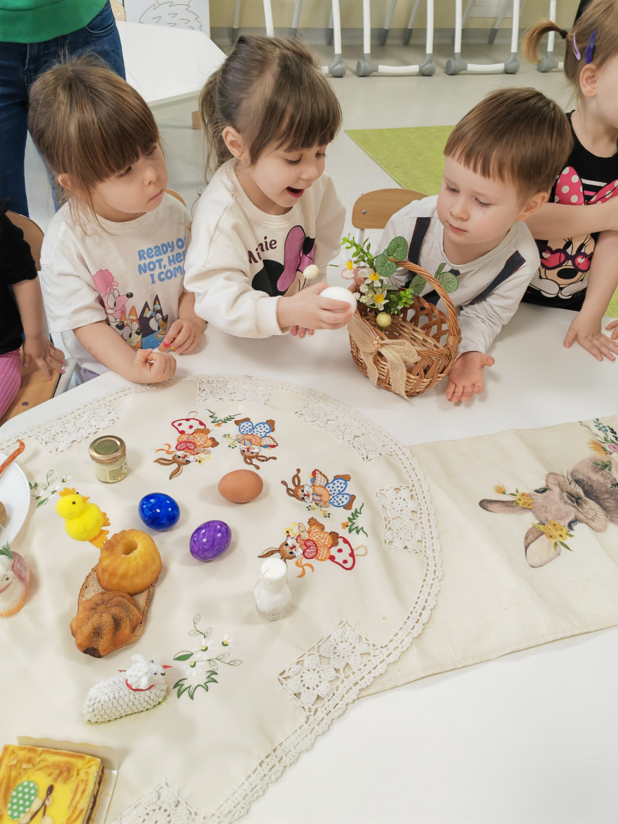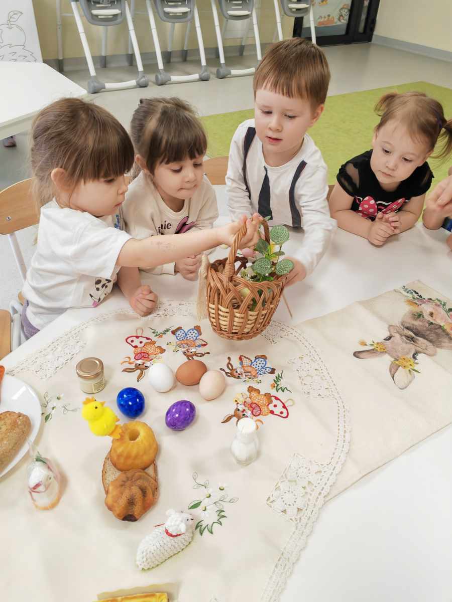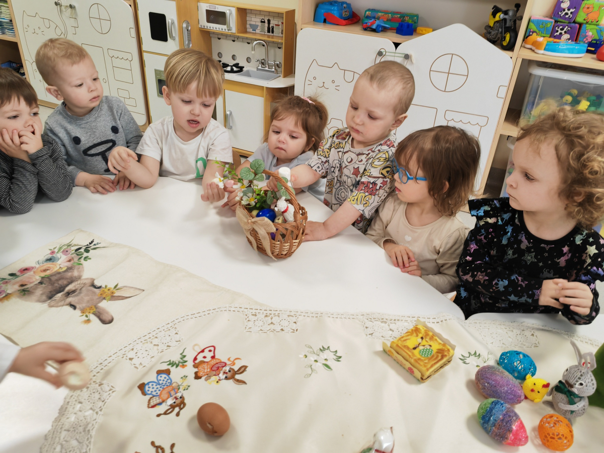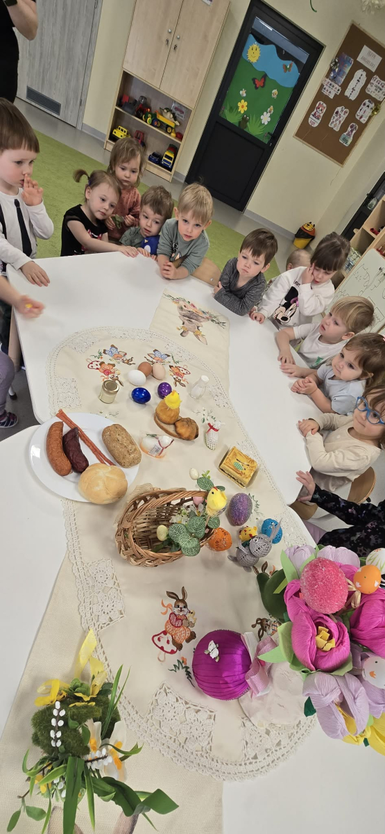 W naszym Żłobku święta Wielkanocy stały się okazją do poznawania tradycji w sposób praktyczny i radosny. Maluszki z ogromnym zainteresowaniem oglądały wielkanocny koszyczek oraz produkty, które się w nim znajdują. Każdy element koszyczka – jajeczka, chlebek, sól, wędlinę, chrzan oraz baranka – został dokładnie pokazany, a dzieci dowiedziały się, że każdy z nich ma swoje symboliczne znaczenie w tradycji wielkanocnej. Zajęcia miały charakter sensoryczny – dzieci mogły dotykać, wąchać i oglądać wszystkie produkty, co rozwijało ich zmysły i wspomagało poznawanie nowych słów. Maluszki z entuzjazmem uczestniczyły w rozmowach na temat znaczenia poszczególnych przedmiotów, zadawały pytania i dzieliły się swoimi spostrzeżeniami. Atmosfera zajęć była pełna radości i ciepła, a wspólne odkrywanie tradycji wprowadziło dzieci w prawdziwie świąteczny nastrój. Warsztaty pozwoliły nie tylko poznać zwyczaje wielkanocne, ale także rozwijały ciekawość świata, kreatywność i umiejętność współpracy w grupie. Dzięki takim spotkaniom maluchy uczą się, że tradycje można poznawać nie tylko słowami, ale także poprzez zabawę i doświadczenie.